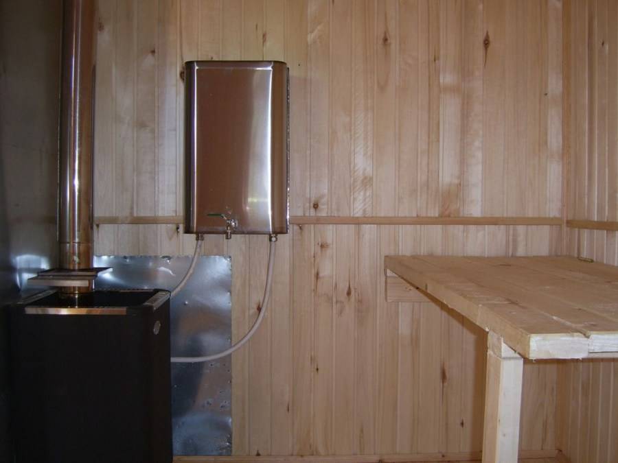 Вот тут все гораздо сложнее, так как вариантов существует масса: и печь со встроенным баком, и емкости на трубу, и выносные баки. Притом последние можно монтировать где угодно, включая корпус печи, моечное отделение или место под полком. Расскажем вкратце о достоинствах и недостатках каждого способа.