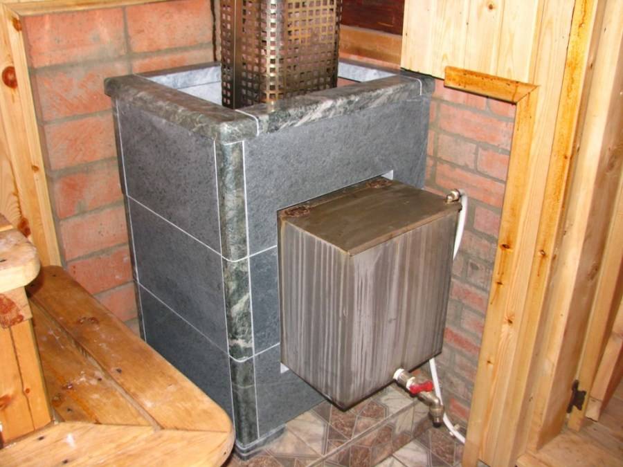 Каменка для бани с баком для воды хороша в классической компоновке. Такая печь делается из кирпича или керамики с металлом. Бак для воды располагают в верхней части печки, которая, при установке, будет обращена к стене.