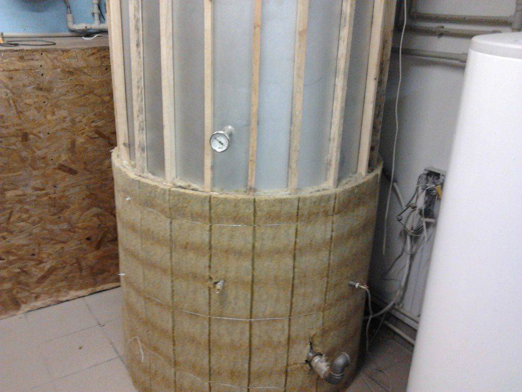 - Оборачиваем резервуар рулонным утеплителем (базальтовой ватой) толщиной 60-80 мм. Закрепляем материал скотчем. Сверху крепим фольгированный утеплитель.