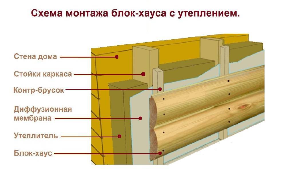 Обрешетку под Блок Хаус производят при помощи каркаса из брусков. Их толщина зависит от толщины теплоизоляционных плит. Например, в центральной полосе РФ используют плиты толщиной не больше 10 см.
