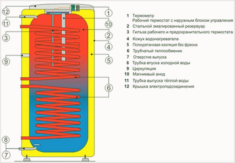 Водогрейное оборудование такого типа оснащается защитным магниевым анодом. Ультрасовременные и престижные модели снабжены парой дублирующих змеевиков. Поддержание температурного режима обеспечивается ТЭНом с термостатом, встраиваемым сверху резервуара.