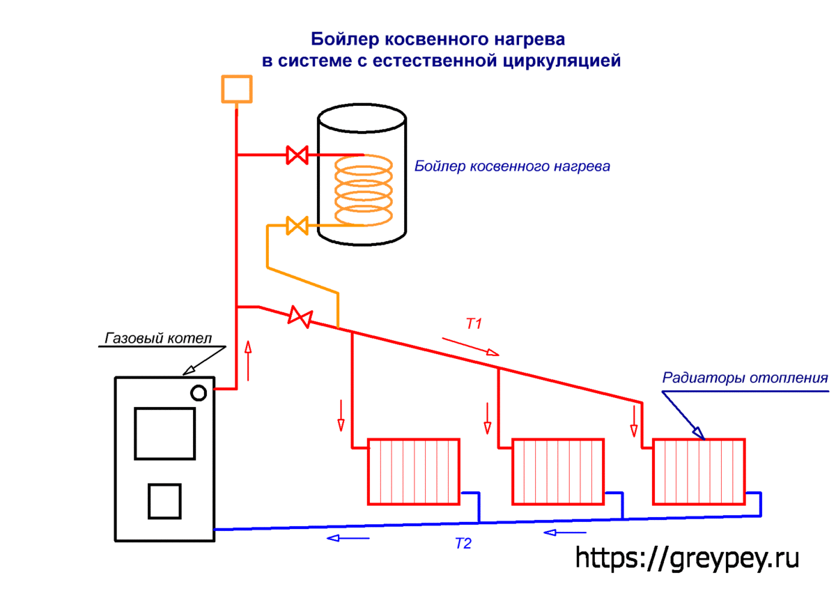 Отличительная особенность данной схемы – установка бойлера на более высоком уровне, чем котел и отопительные приборы. Предпочтение отдается настенным моделям, которые можно подвесить на высоте 1 м над полом.