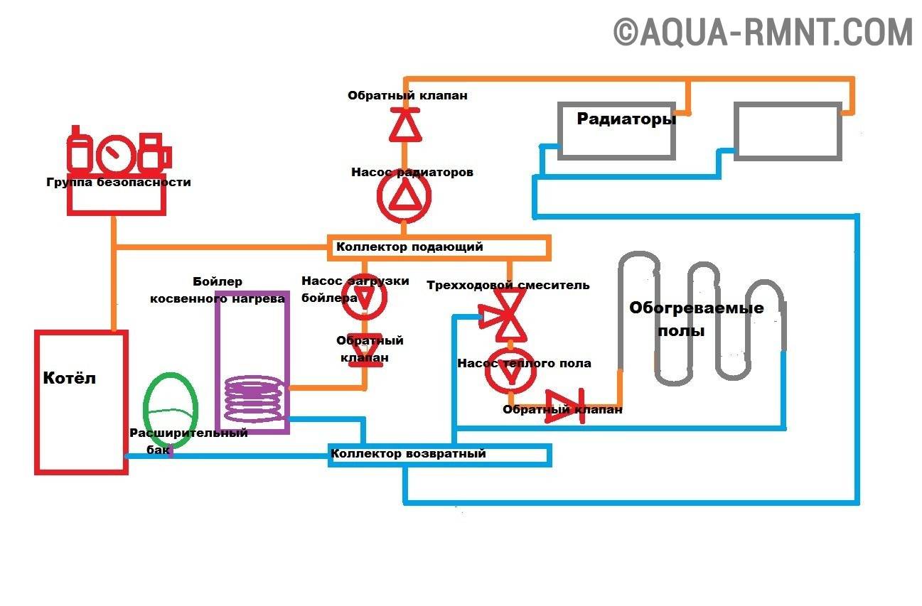 Данная схема успешно применяется, если используется несколько обогревательных приборов, например, два разных котла.