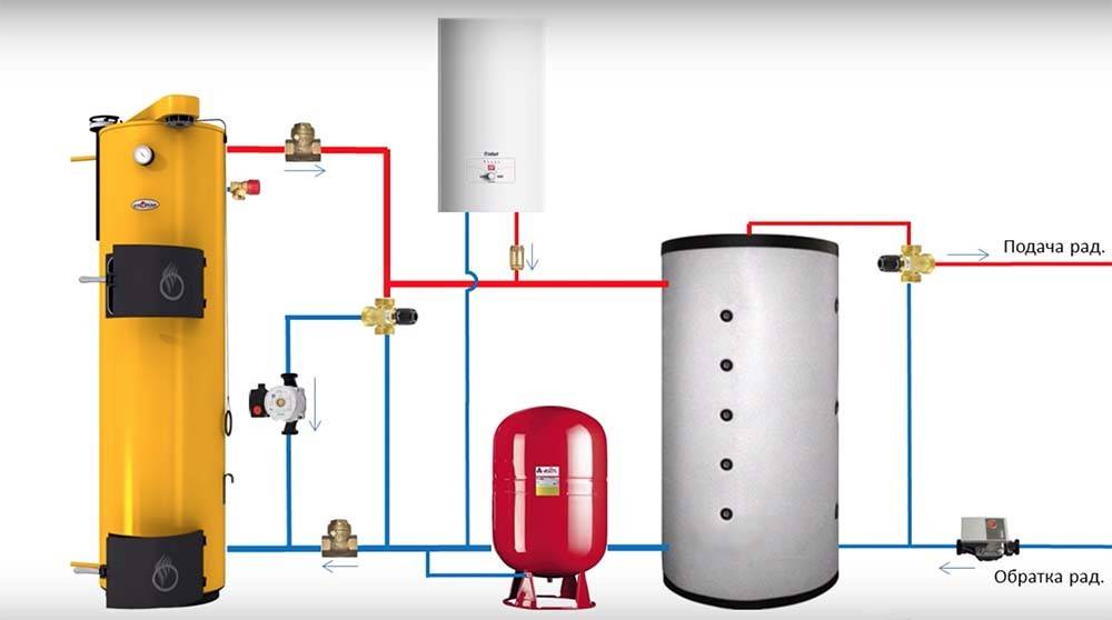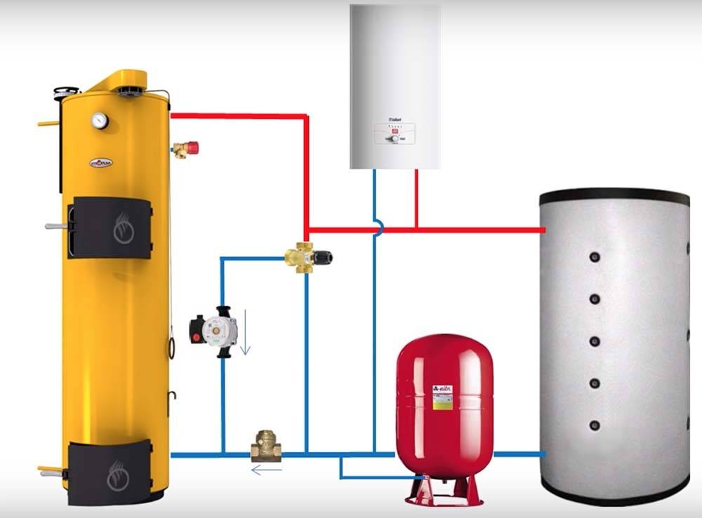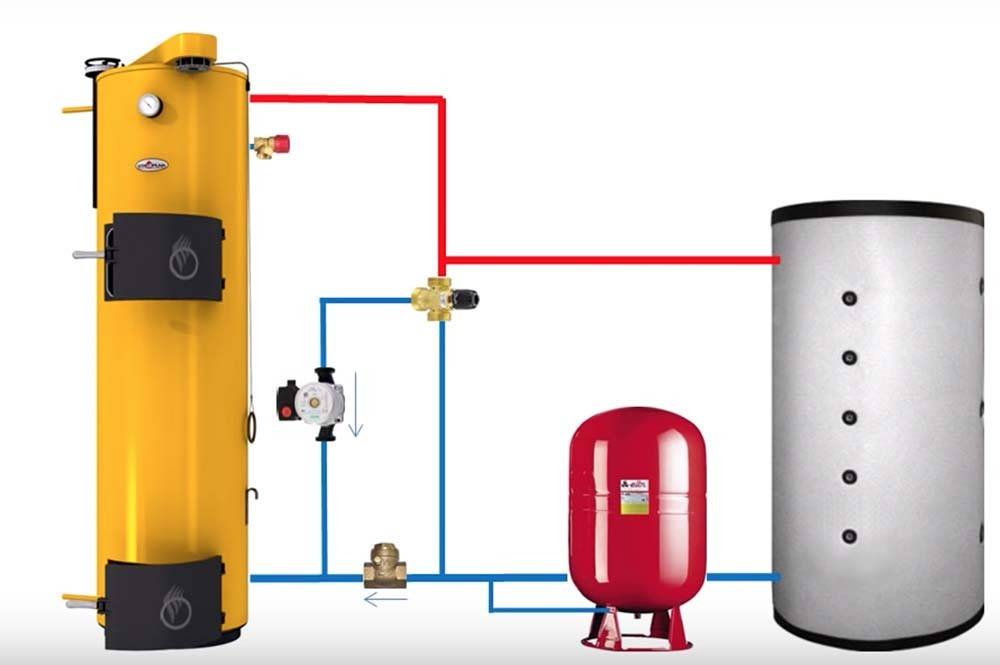 После нескольких подобных циклов работы имеем общее понижение температуры в буферной емкости для котла, труб и радиаторов. Защищаем теплообменник котла от попадания на него излишне холодной воды, что выводит его из строя раньше времени. Как правило, с режим топки выбирают по опыту, таким образом, чтобы разогревать теплоноситель до 80 градусов. Некоторые модели уже укомплектованы ею на производстве.