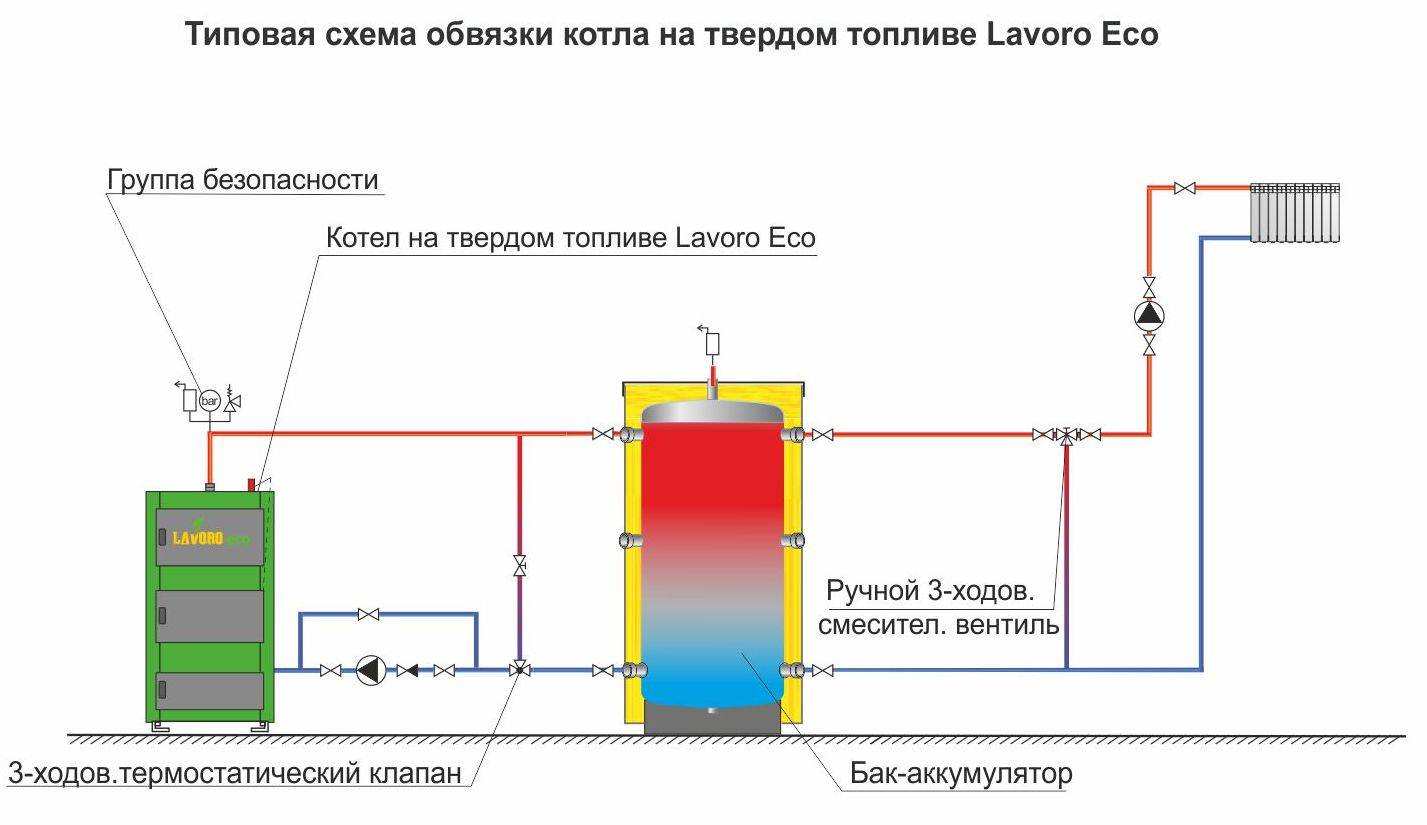 Схема обвязки твердотопливного котла отопления с теплоаккумулятором применяется для поддержания постоянной температуры в системе (ТТК плохо управляются, требуя неустанного контроля за количеством топлива и тягой) и во избежание закипания рабочей жидкости.