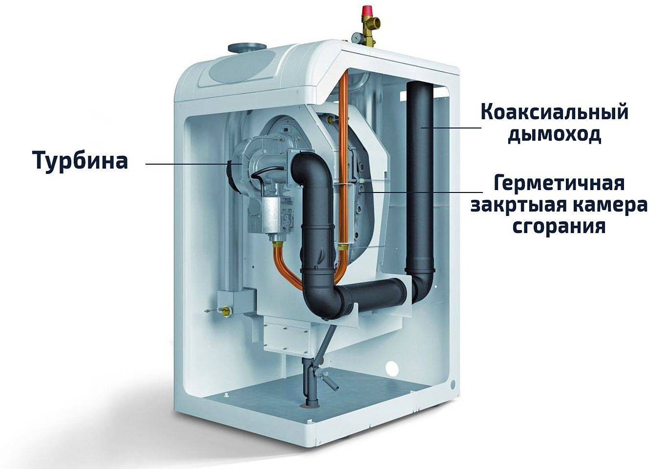Турбированный газовый котёл – отвечающий за теплоснабжение агрегат, который дополнительно оснащается системой принудительного воздухообмена. В силу этой особенности, он не требует обустройства полноценной дымовой шахты, т. к. сообщение с внешней средой происходит через коаксиальный дымоход.