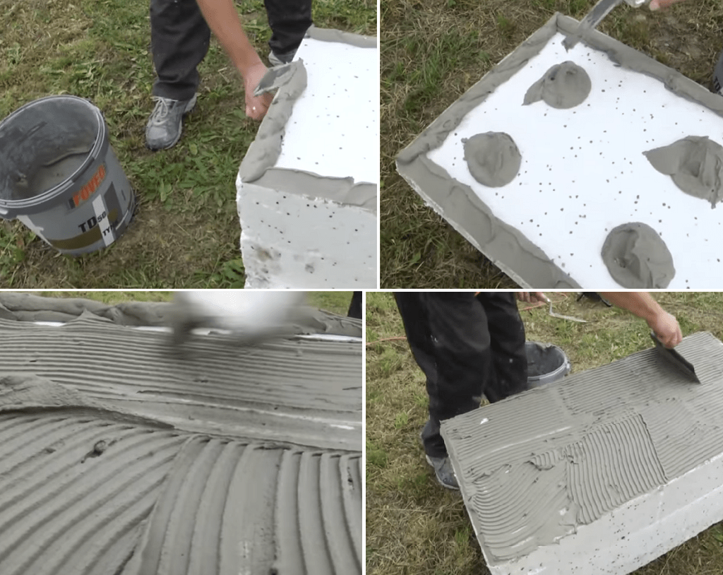 соседние панели приклеиваются встык, вся площадь утеплителя закрыта плитками. Для фиксации используется монтажная пена или клей. Время, необходимое для монтажных работ, из-за этого увеличивается, однако цоколь не нужно предварительно выравнивать, да и конвекции воздуха между ним и термопанелями не будет (а значит, улучшится теплосбережение).