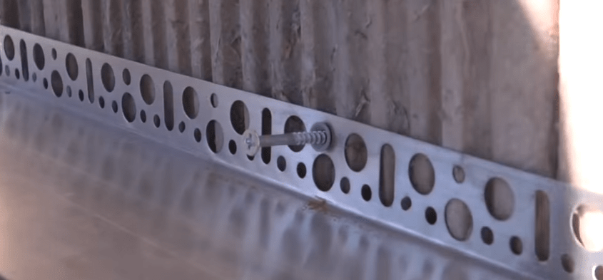 Сначала к нижней горизонтальной направляющей каркаса крепится стартовая планка. Она должна идти по периметру строения и выставляется по уровню в строго горизонтальном положении. Для фиксации планки используем саморезы, которые вкручиваем в центральную часть продолговатого крепёжного отверстия. Чтобы обеспечить возможность температурных расширений материала, крепёж не стоит вкручивать слишком туго, лучше оставлять зазор в 1 мм между элементом и головкой крепежа.