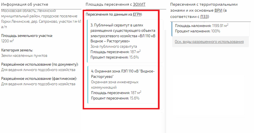 Например, на участке выше есть два взаимосвязанных ограничения — «Публичный сервитут в целях размещения существующего объекта электросетевого хозяйства «ВЛ 110 кВ Видное – Расторгуево» и «Охранная зона ЛЭП 110 кВ «Видное-Расторгуево» Охранная зона инженерных коммуникаций». У обоих площадь пересечения — 187 м2; процент пересечения — 15.6%. Проще говоря, рядом проходит ЛЭП, из-за которого наложили ограничение на часть участка. Если дом стоит на обремененной части, придется брать согласие эксплуатирующей организации. Чтобы узнать координаты ограничений, заказываем выписку ЕГРН.
