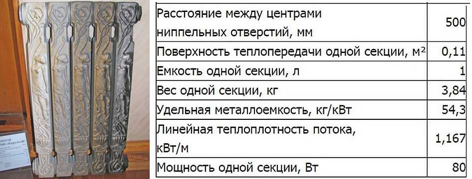 - у первой модели мощность 1 секции чугунного радиатора в кВт составляет 0,120 единиц;