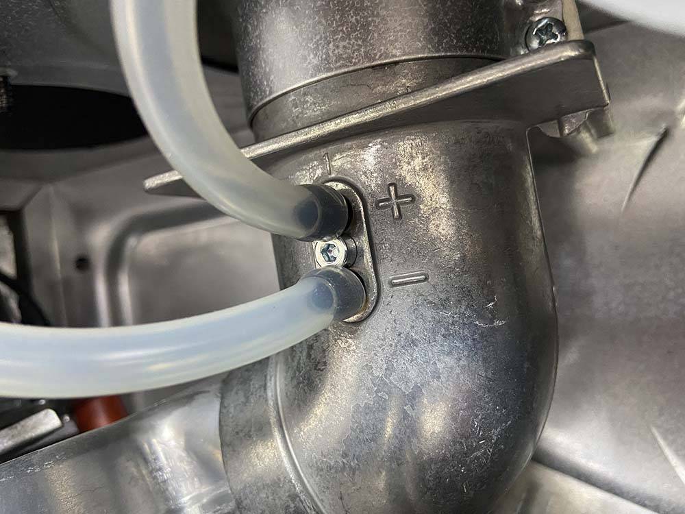 Прессостат, контролирующий вентилятор газового котла, располагается в непосредственной близости к нему и соединён с ним силиконовыми трубочками. Для того чтобы увидеть принцип работы, необходимо разобрать котел.