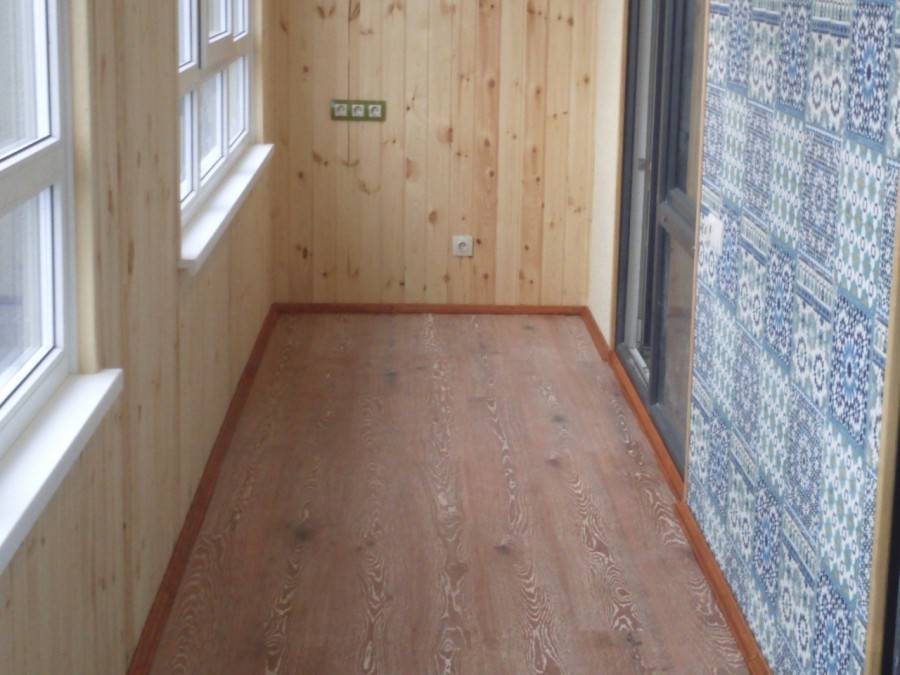 Стены лоджии обшиты вагонкой, напольное покрытие – ламинат.