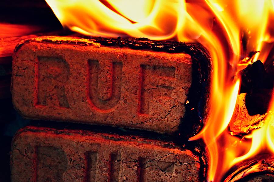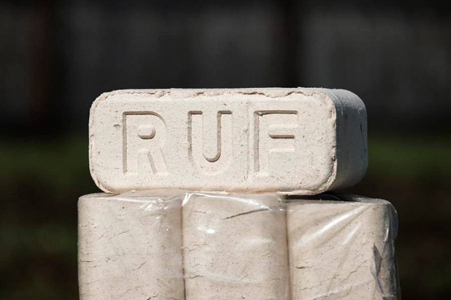 Стандартный размер брикетов РУФ составляет 65х95х150 мм. Своё название они получили от немецкой компании RUF, являющейся производителем гидравлических прессов, используемых в производстве брикетов. Основное сырьё для их изготовления – опилки и древесная щепа.
