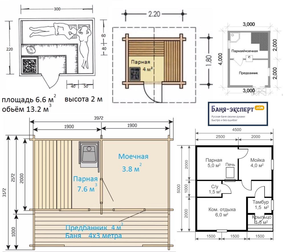 Первый шаг. Рассчитываем объем парного помещения. Для этого нам надо замерить его длину, ширину, а также высоту. После перемножаем полученные числа, находя таким образом показатель объема. Если сохранилась проектная документация, обращаемся к ней и избавляем себя от этого этапа расчета. Допустим, длина нашей парилки равна 2 м, ширина – 1,5 м, а высота – 2,2 м. Объем этого помещения составит 6,6 м3.