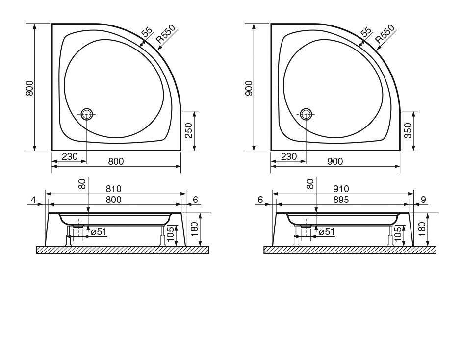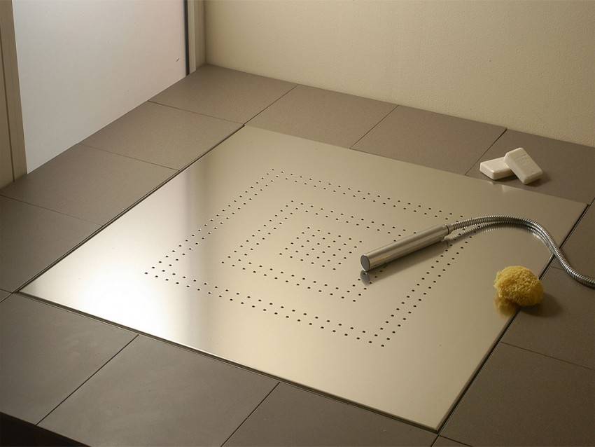 Основание бывает с поддоном разной высоты, поднятым на подиум, на уровне пола помещения. Слив воды происходит через установленный душевой трап и канализационные трубы.