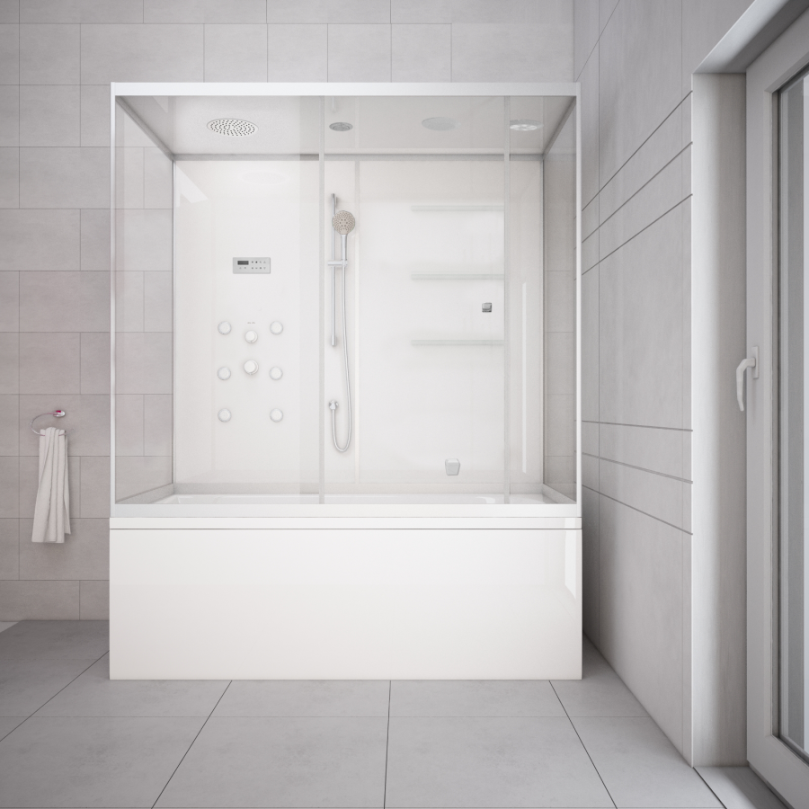 Кабина имеет прямоугольную форму. Рассчитана на установку в просторных ванных, в которых нет необходимости в экономии места. Есть возможность монтировать как возле одной стены, так и в углу ванной комнаты. Производители дополняют стандартный набор функций подсветкой, радио и гидромассажем. Электронная панель управления позволяет удобно регулировать функции.
