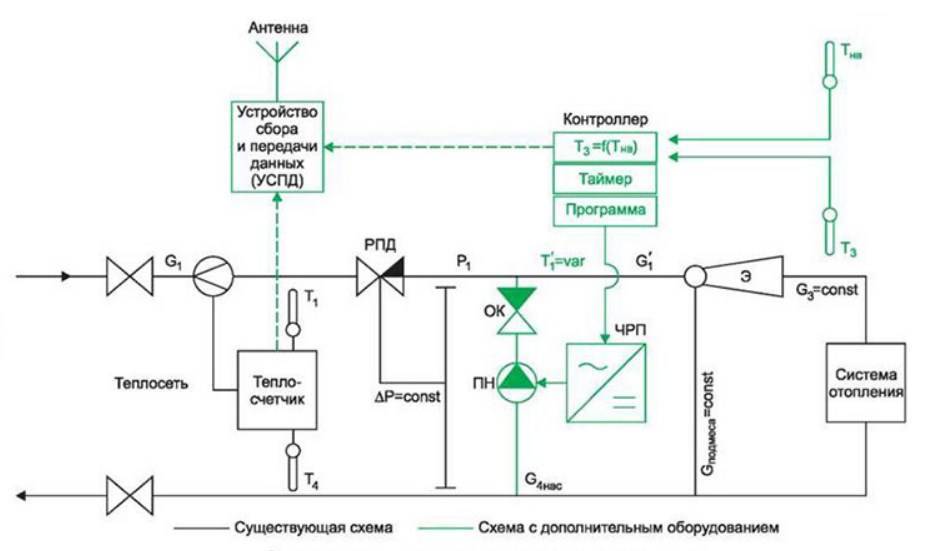 Подобные схемы используются при отсутствии достаточного для функционирования элеватора давления в питающих трубопроводах.