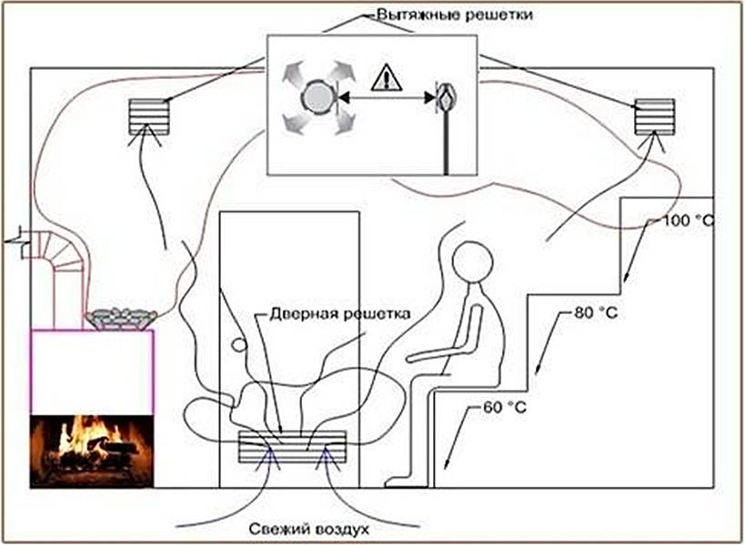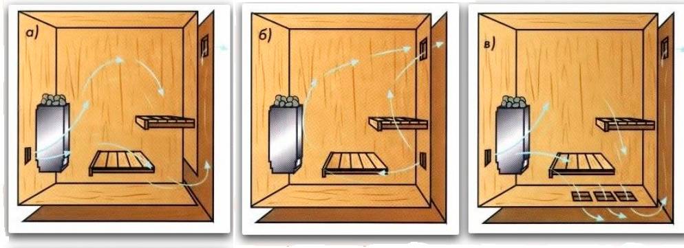 Но в ней необходимо поддерживать комфортную для приема процедур температуру, причем так, чтобы не образовывались сквозняки, и не было резкого перепада от жары на полке до холода на полу. Для этого воздушные потоки должны двигаться по определенной траектории, которую задают посредством размещения приточных и вытяжных отверстий в конкретных местах.