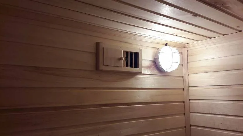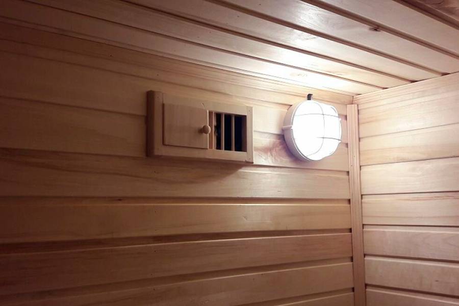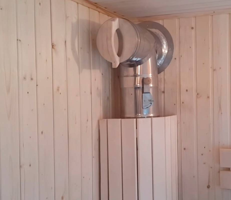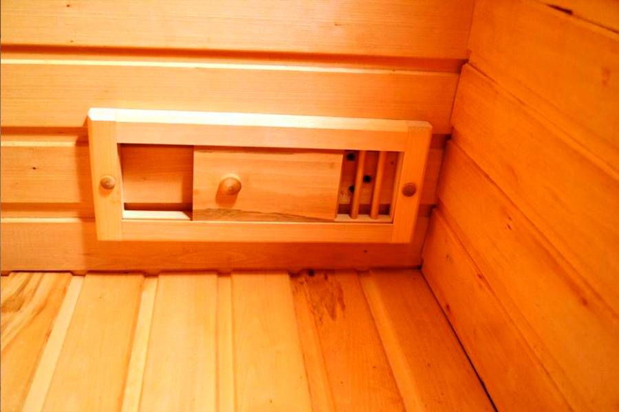 Приток организуют за нагревательным прибором, отверстие закрывают решеткой. Вытяжной канал оборудуют в средней части помещения, между полками. Для проветривания небольшого «закутка» после оздоровительной процедуры в потолке кабинки делают вентиляционный клапан.