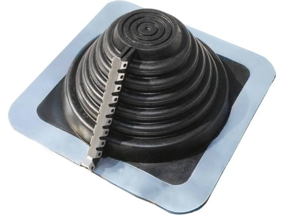 Конструкция имеет и фланец, приспособление, которое является основанием и также изготовлено из резины. По периметру, для надежного крепления, основание имеет ленту из алюминия или оцинковки, которая позволяет не только создать необходимый рельеф идентичный с крышей, но и плотно, а главное герметично установить «фартук».