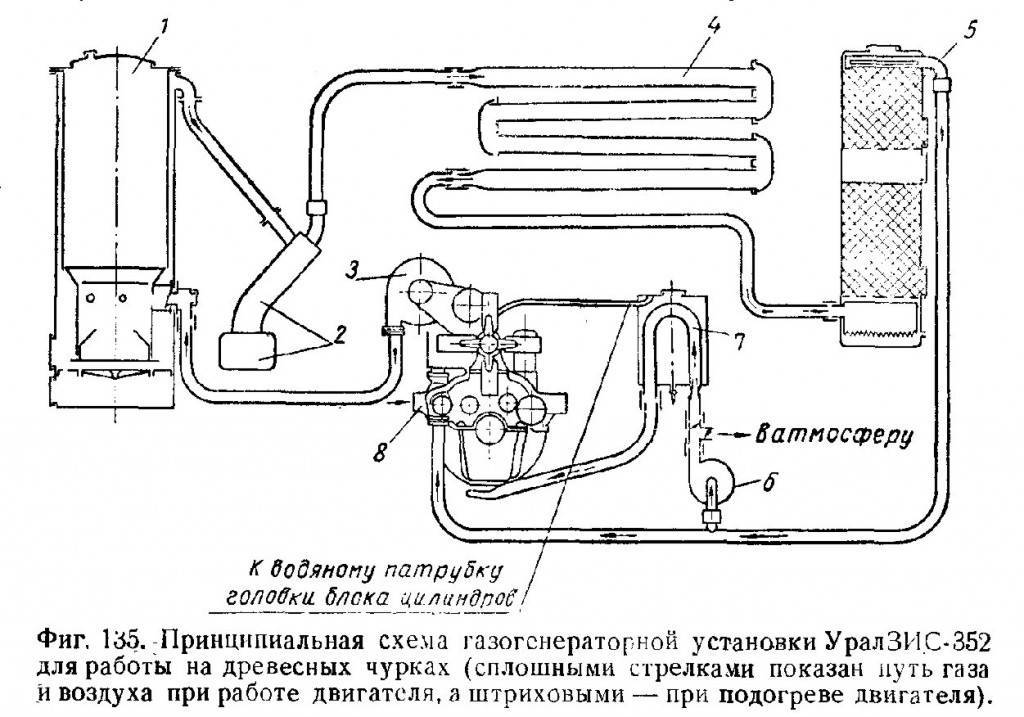 На изображении внизу приведена схема самой совершенной автомобильной газогенераторной установки, которой оснащались серийные автомобили (речь идет о грузовике «УралЗИС-352″, выпускавшимся в 1950-х гг.). Именно на ее конструкцию лучше всего ориентироваться при сборке своего газогенератора: