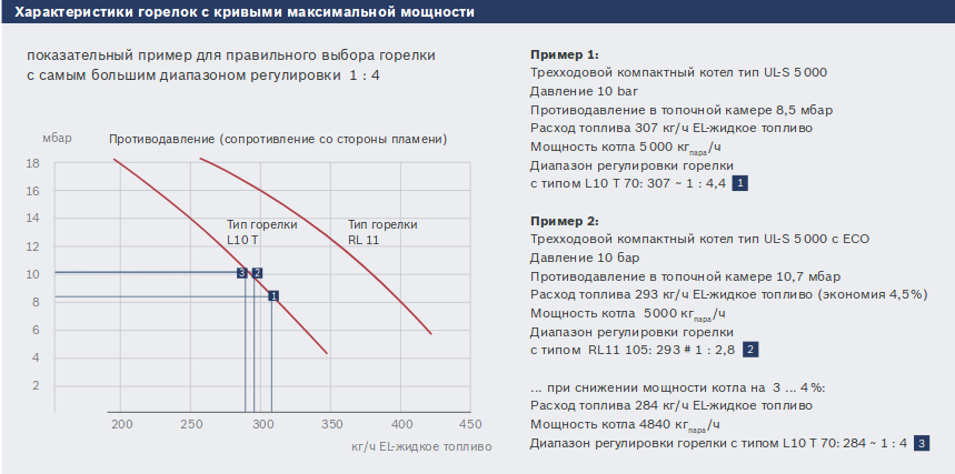 Тип горелки можно определить по графикам кривых максимальной мощности. Например, для трехходового компактного котла типа Bosch UL-S мощностью 5 т/ч с давлением 10 бар противодавление в топочной камере составляет 8,5 мбар, расход жидкого котельного EL-топлива 307 кг/ч. При таких условиях целесообразно использовать дизельную горелку типа L10T с широким диапазоном регулирования 70:307, или 1:4,4.
