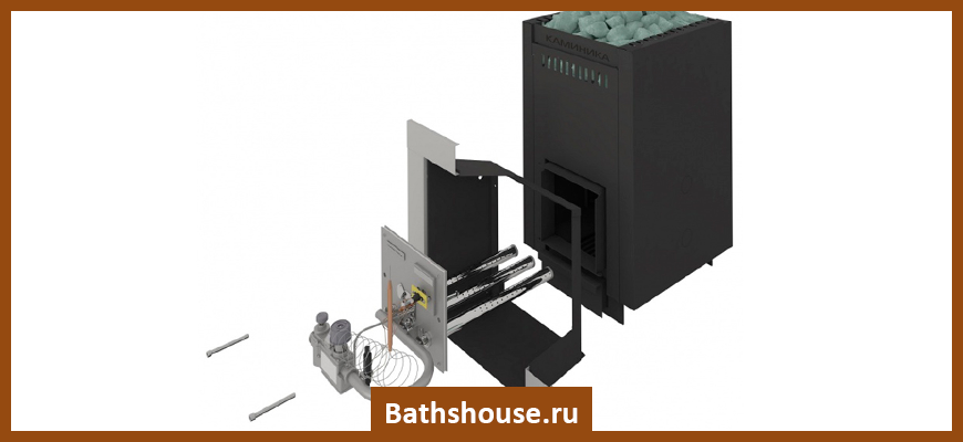 Конструкцию устанавливают на положенное место так, чтобы дверка каменки открывалась к стене. Далее выполняют подключение труб согласно приложенной к инструкции схеме. Все щели и пазы герметизируют специальными огнестойкими составами. Нередко металлические газовые печки обкладывают кирпичом для повышения эстетичности и приближения к традиционному стилю.