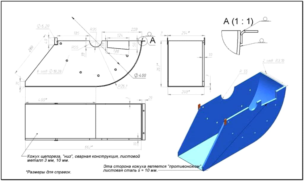 Для защитного кожуха, и воронки для приемного бункера подойдет листовое железо толщиной 8–12 мм. Листы нарезаются в размер и свариваются в конструкцию так, как указывают чертежи. Нарезаем все детали по заранее подготовленным «выкройкам» (их делаем из плотного картона) Ребра жесткости делаются из уголков, швеллеров или труб.