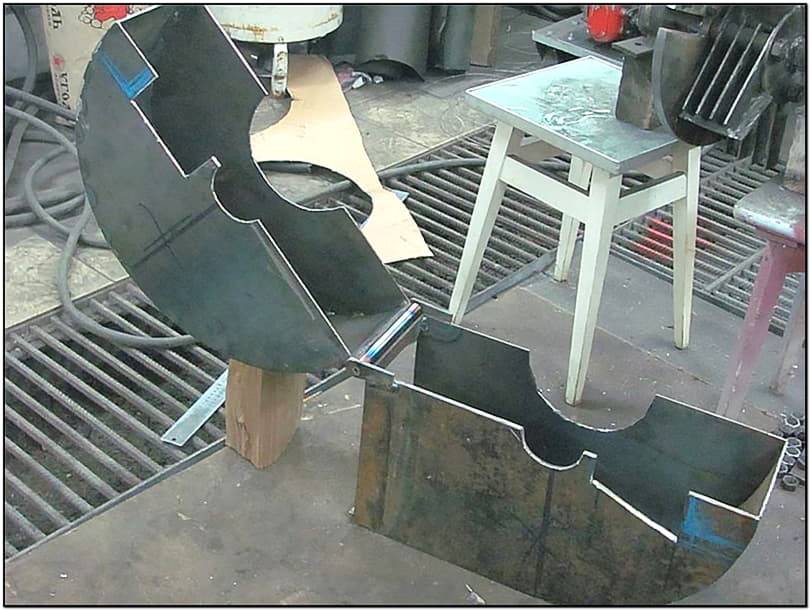 Для создания защитного кожуха, приемочной воронки бункера приема может использоваться листовое железо толщиной 8-12 миллиметров. Листы режут в размер, сваривают по чертежу. Детали режут по заранее известным размерам и «выкройкам» (их можно подготовить заранее, используя плотный картон). Ребра жесткости делают из труб, швеллеров либо уголков.