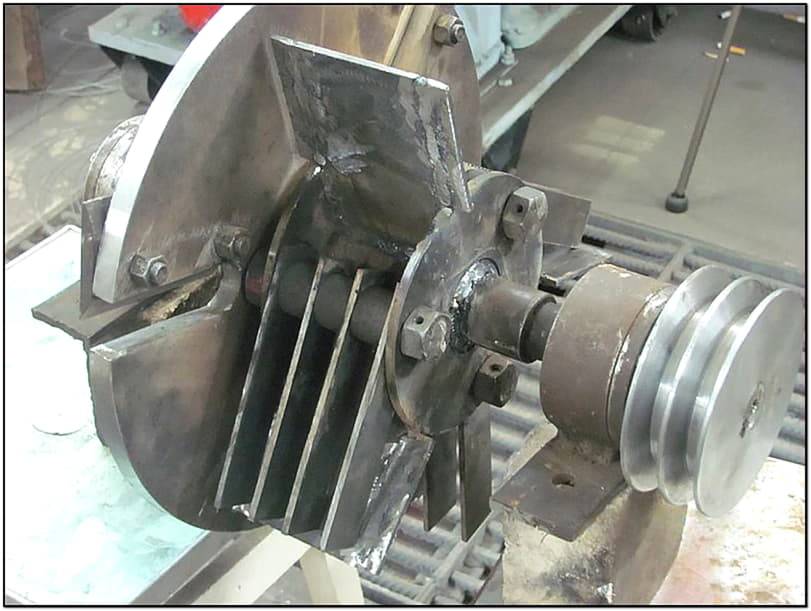 Оборудование дробильного узла: цапфы вала, на которые необходимо насадить опорные подшипники, плюс била (молотки) и режущий диск. Следующий шаг по изготовлению щепореза — нужно вырезать отверстия для рабочего вала, а также входные и выходные раструбы для подачи сырья и выхода щепы.