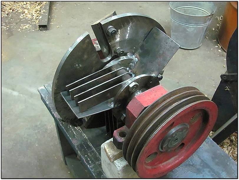 Измельчитель этого типа является более мощным и позволяет измельчать сучья и ветки диаметром до 7 см. Он изготавливается на базе станка, а это значит, что станину делать не нужно. Необходимо изготовить только короб подачи для веток.