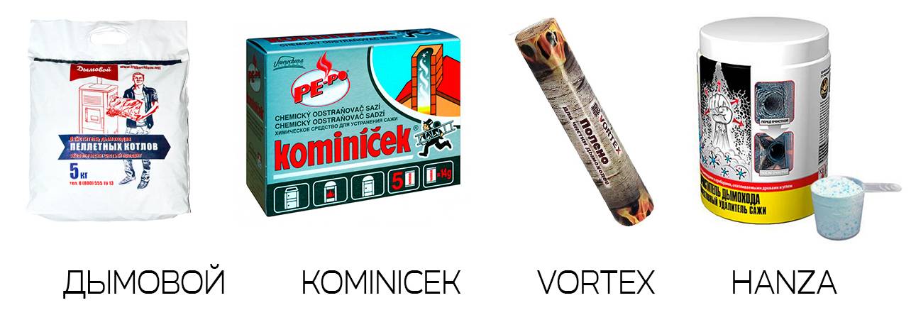 Среди самых популярных средств для чистки труб от сажи можно выделить следующие: