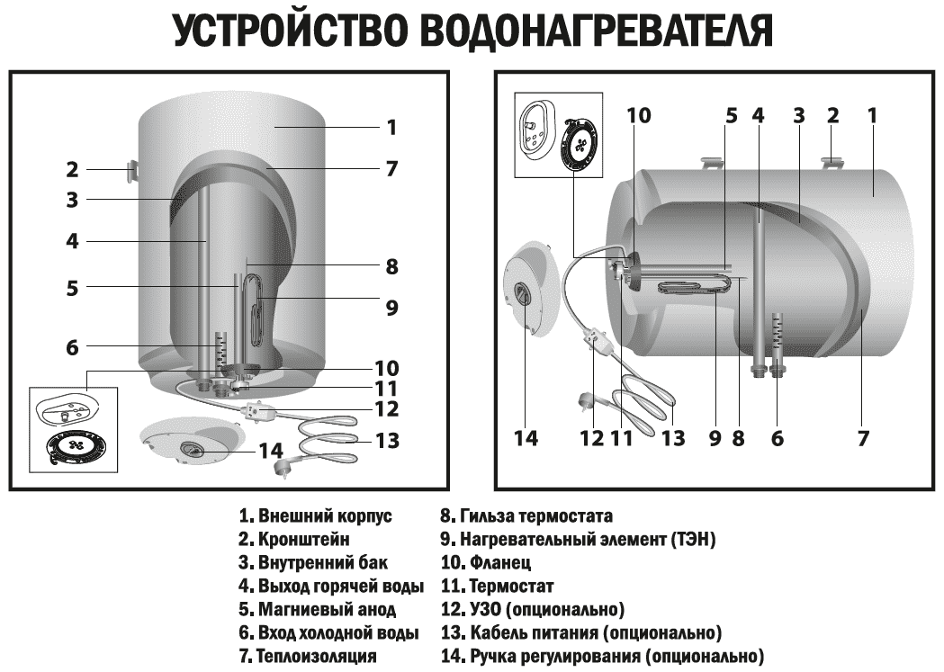 Собирается устройство из проволочной спирали, которая помещается в металлическую оболочку, за счет которой провода не соприкасаются с водой, но нагревают трубку. В нагревателе такая деталь находится внутри, контактируя в процессе работы с водой. В результате прохождения тока через ТЭН происходит нагрев имеющейся в бойлере жидкости. Металлическая трубка, как правило, изготавливается из «нержавейки» или медного сплава. Электротэны являются основными элементами водонагревательных баков любого типа. В качестве источника питания прибора выступает электрическая сеть.