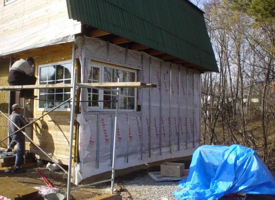 При возможности, сечение бруса подбирают больше толщины плит минеральной ваты. Иногда для экономии материала, направляющие каркаса устанавливают на требуемом расстоянии от стены дома с помощью стоек.