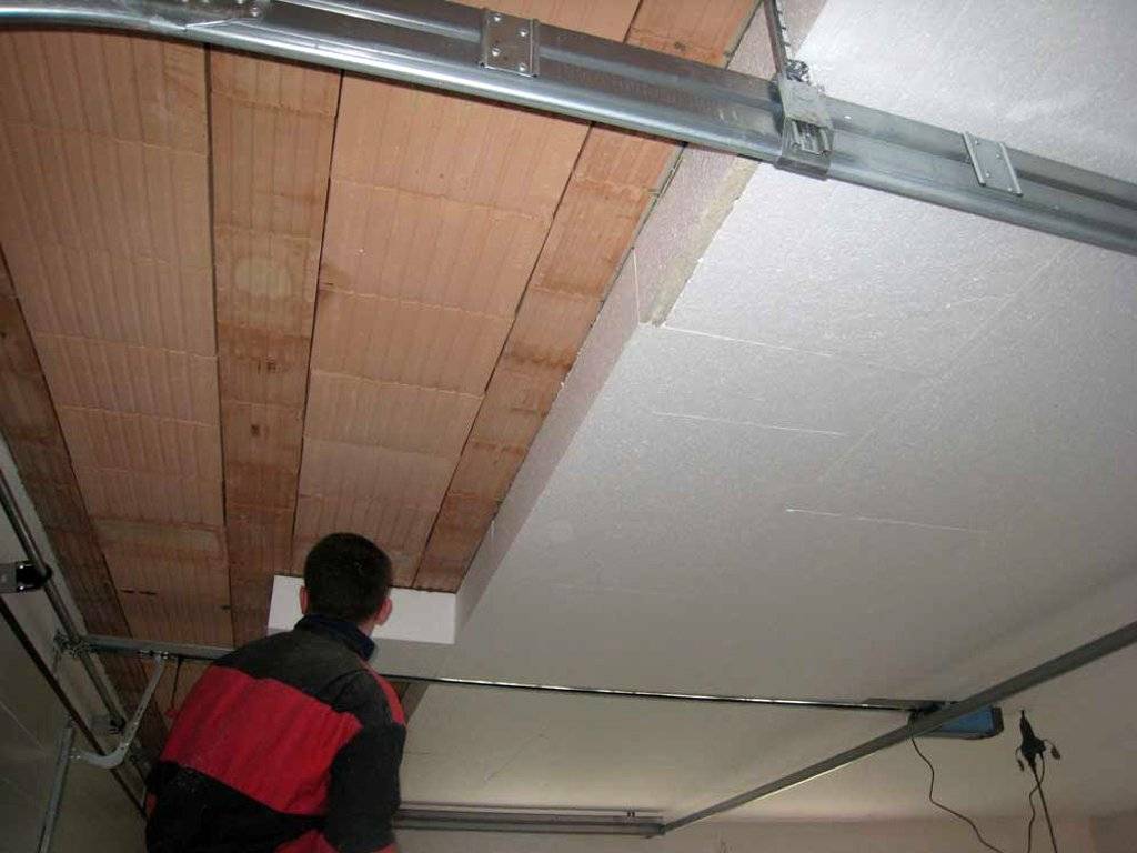 Кровля гаража зачастую держится на металлических балках двутаврового профиля. При монтаже направляющих для утеплителя сверлить отверстия снизу вверх в стальной балке неудобно, поэтому применяют способ, показанный на рисунке. Плиты теплоизоляции укладывают двумя слоями с перекрытием. Вместо волокнистых материалов можно попробовать эковату. В этом случае можно обойтись без фольгоизола, а вместо него по фальшпотолку постелить крафт-бумагу.