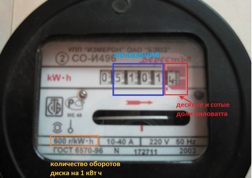При снятии показаний с индукционного прибора, обращают внимание на первые 5 цифр (у некоторых моделей 4). Последняя цифра обычно ставится немного отдельно или выделяется другим цветом, она относительно быстро вращается – ее, как правило, не пишут в квитанцию (для ровного и более простого счёта) – это показания после «запятой» в десятичной дроби