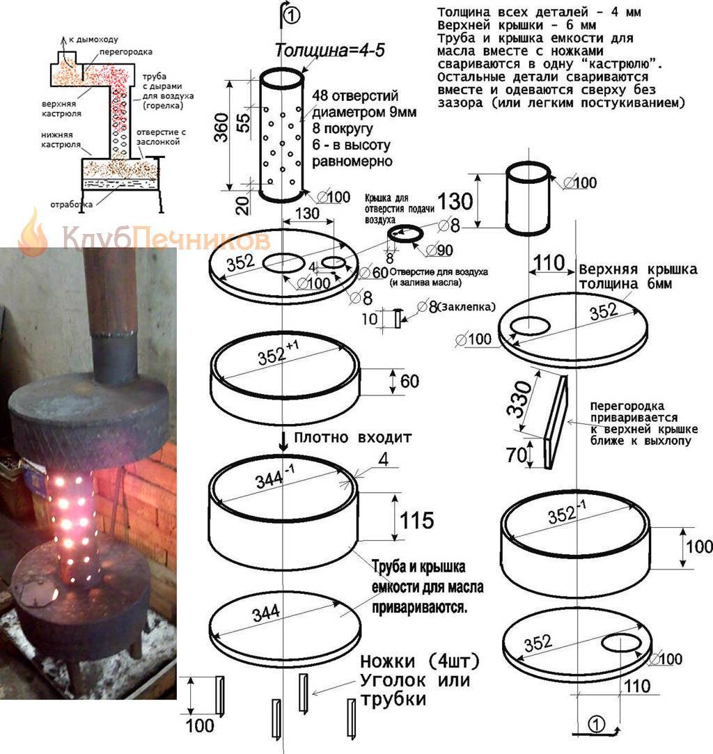 Самые легкие фракции сгорают сразу, а остатки догорают в «верхней кастрюле» – дожигателе. Дожигание происходит в общем в 2 стадии; чтобы они не мешали друг другу и не портили КПД печи, дожигатель разделен неполной перегородкой. Как выглядит такая печь в металле, показано слева внизу на рис.