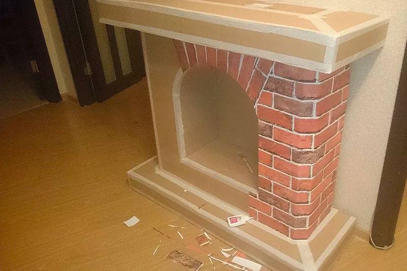 Если вам недосуг вырезать сотни кирпичиков, обратите свой взор на строительные магазины. Там есть плиты, имитирующие кирпичную кладку. Вы можете «повторить» на них «выкройку» камина и обклеить сразу и быстро все изделие. Не забудьте обработать места стыков либо затиркой похожего цвета, либо просто вооружившись кисточкой и краской нужного оттенка.