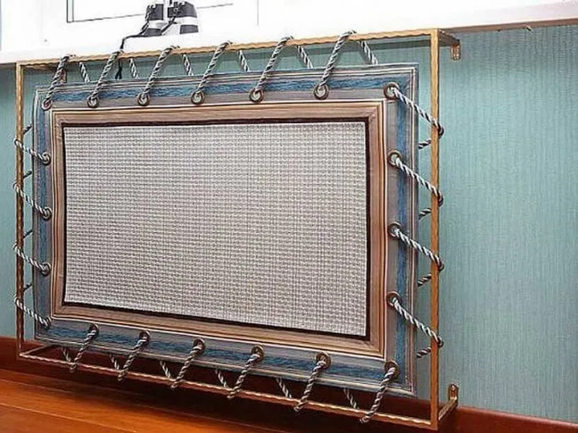 Ещё один вариант, это взять деревянную раму по размеру радиатора и при помощи саморезов натянуть на неё с обратной стороны ротанговый лист. Крепить подобный экран своими руками ещё проще. С обратной стороны рамы прибиваете две петли, а на батарею, на веревочку вешаете крючки, под эти петли. Чтобы такая решётка висела ровно надо опытным путём проверить как повесить крючки.