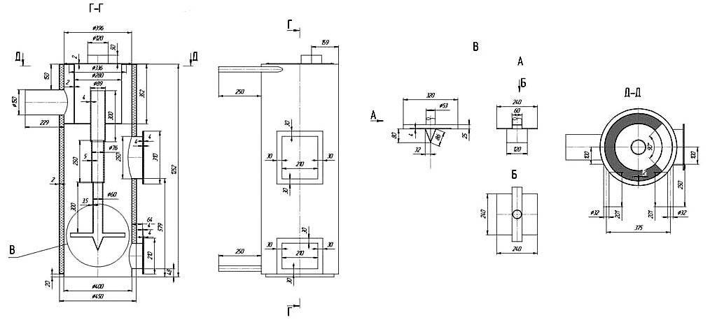 Но все-таки более мощный котел длительного горения для водяного отопления разработан. Повторить промышленные образцы сложно, но конструкцию, представленную на чертеже, можно собрать дома.
