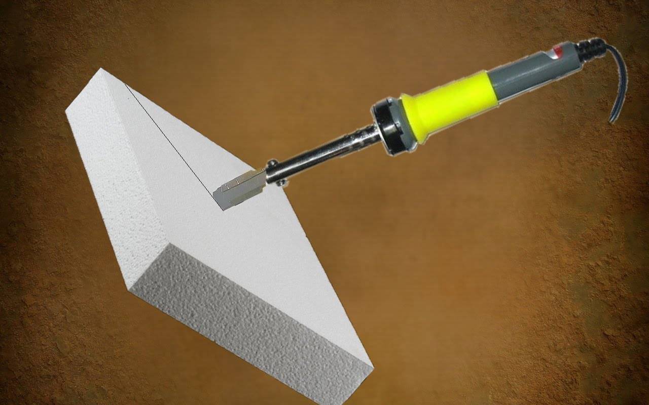 Пенополистирольные плиты отлично поддаются обработке с использованием паяльника. Данный инструмент дает возможность выполнять работы в наиболее минимальные сроки. Для проведения подобных работ паяльником, его конец необходимо расплющить молотком. На него необходимо надеть специально подготовленную деталь, которая предварительно изготовлена из лезвия, колпачка ручки перьевой, выполненного из стали.