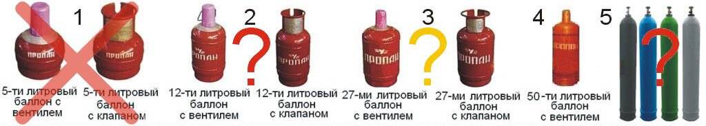 Газовые баллоны бывают разного объема. Самый маленький из них, пятилитровый, для изготовления топок непригоден. Он сам по себе крошечный для сколько-нибудь значимой массы топлива, плюс тепло из него будет уходить слишком быстро, из-за чего дрова не успеют прогореть полностью.