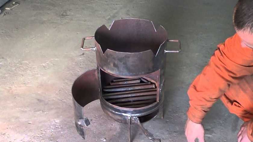 Простота конструкции позволяет сделать печь небольшого размера. В этом случае печь становится мобильной. Если смотреть упрощенно, то это кусок металлической трубы, по форме похожий на печь-буржуйку, только без верха (если он отсутствует, его заменит казан). Размеры печи — произвольные. Диаметр казанов, которые ставятся на печку, можно регулировать при помощи переходных колец. Кольца добавляются, или убираются, в зависимости от диаметра казана.