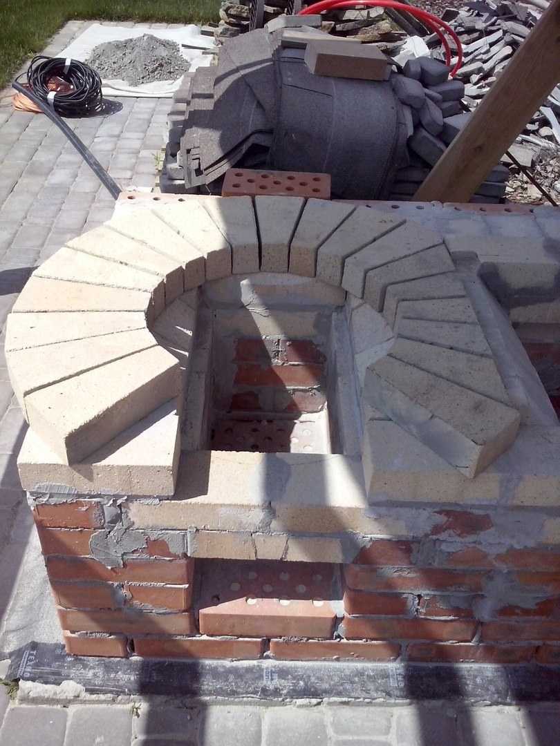 - Перекрывается мангал и создается дымовой зубец двумя арками из огнеупорного кирпича. Задняя арка должна быть выше передней на 2 ряда.
