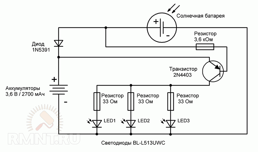 Для сборки такой схемы не обязательно иметь текстолитовую основу и вытравливать дорожки. Катоды (короткая ножка) всех светодиодов собираются в один узел, к анодам (длинная ножка) припаиваются резисторы на 33 Ом. Хвосты резисторов также спаиваются вместе и припаиваются к коллектору транзистора. С базой транзистора соединен резистор на 3,6 кОм, а с эмиттером — катод выпрямительного диода. Анод диода соединен с резистором базы, на этот же узел подается положительный полюс солнечных модулей. Минус от модулей и аккумулятора соединен проводами с объединенными катодами светодиодов. Положительный полюс аккумулятора подключается к эмиттеру транзистора.