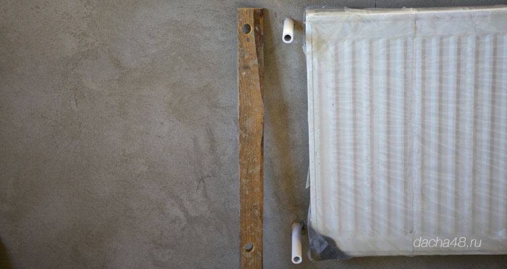 Это кусок штакетины с просверленными отверстиями в 20 мм, с строго соблюденными расстояниями между центрами. Это расстояние должно соответствовать межосному расстоянию на входах и выходах у радиаторов. В моем случае это было 45 см. Расстояние на радиаторах можно либо замерить, либо посмотреть в документации к батареям.