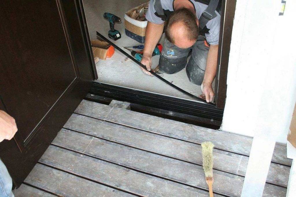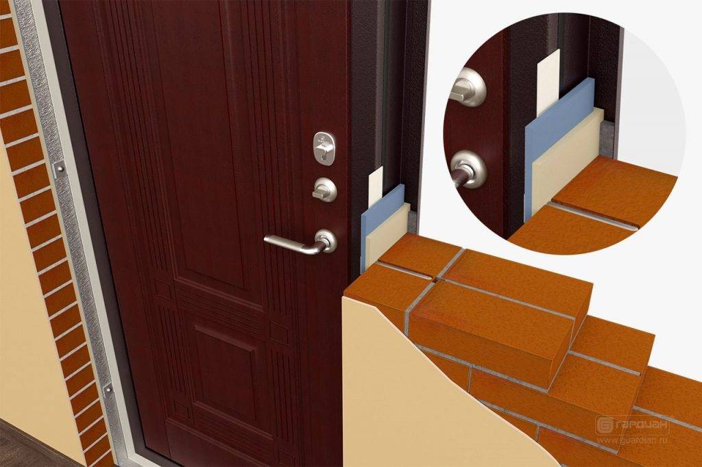 Все входные двери монтируются с порогами, так как этот элемент играет важную роль для обеспечения безопасности и изолирующих свойств. Чаще всего, для входных дверей данный конструктивный элемент выполняется из тех же материалов, что и полотно. Производитель далеко не всегда обеспечивает дополнительное утепление данного элемента, и владелец жилья вынужден выполнять эту работу самостоятельно: