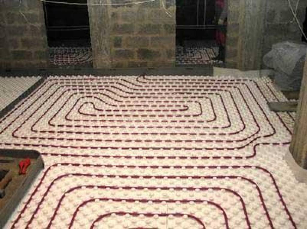 Трубы с поперечной прошивкой PE-Xa марки Rehau отличаются оптимальной гибкостью. Для простоты монтажа изделия оснащены аксиальными фитингами. Максимальная плотность, эффект памяти и фитинги с надвижными кольцами – отличные характеристики для использования их в системах теплых половДля удобства обслуживания и дополнительной защиты коллекторно-смесительный узел помещают в шкаф, расположенный в доступном месте. Его можно замаскировать в нише, встроенном шкафу или гардеробной, а также оставить в открытом видеДва способа укладки контура: «змейка» — простая, но имеющая заметную разницу температуры в начале и конце контура; «улитка» — более сложная в монтаже, но она позволяет уложить нагревательный контур с минимальным шагом и решить проблему недостаточной гибкости трубНа графике, актуальном для системы со стяжкой 70 мм и плиточным покрытием, продемонстрирована зависимость плотности теплового потока от средней температуры теплоносителя. Сплошные линии – это трубы диаметром 16 мм, пунктирные линии – 20 мм (+)Схема монтажа по грунту (снизу вверх): грунтовое основание (150-200 мм); щебень (80-100 мм), песок (50 мм); черновая стяжка для выравнивания; гидроизоляция (полиэтиленовая пленка), утеплитель (экструдированный пенополистирол 50-70 мм); чистовая стяжка с армированием и трубамиЭкструдированный пенополистирол продается в виде плит (размеры – 60 см х 125 см и 50 см х 100 см) с боковыми пазами для облегчения процесса монтажа. Толщина может быть различной – от 2 см до 10 смСтандартные размеры профильных матов пенополистирола высокой плотности – 50 см х 100 см и 60 см х 120 см, толщина – от 1 до 3 см. Цена – от 270 руб. до 600 руб. за 1 м²