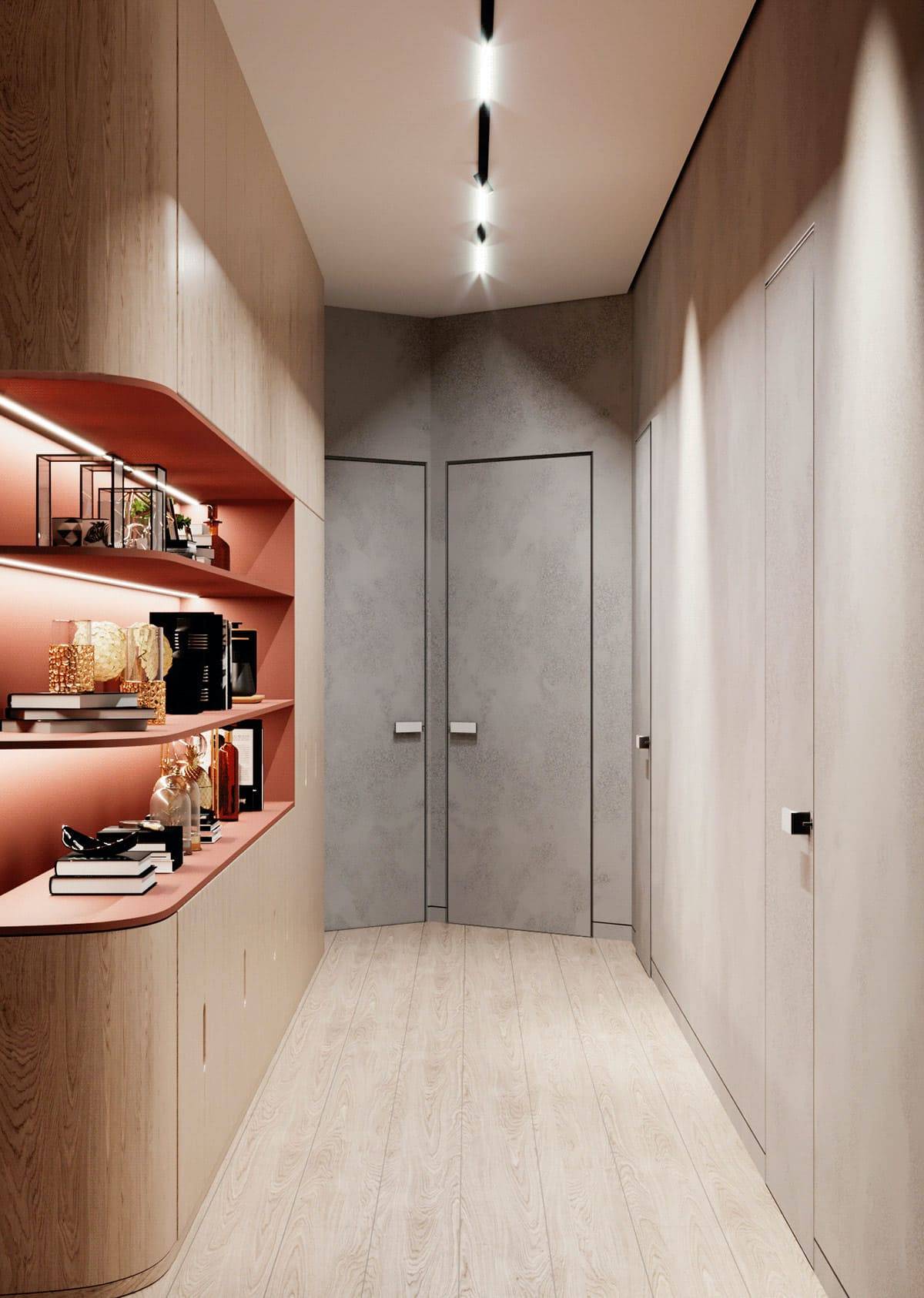 Цвет и текстура покрытий могут сильно различаться. Они выбираются в зависимости от характеристик рассматриваемого коридора. Комбинируя материалы, оттенки и текстуры, можно добиться наилучших результатов. Светлые оттенки оптически расширят пространство, а темные — сузят его. Умелое использование узоров, освещения и установка зеркал могут усилить эффект.