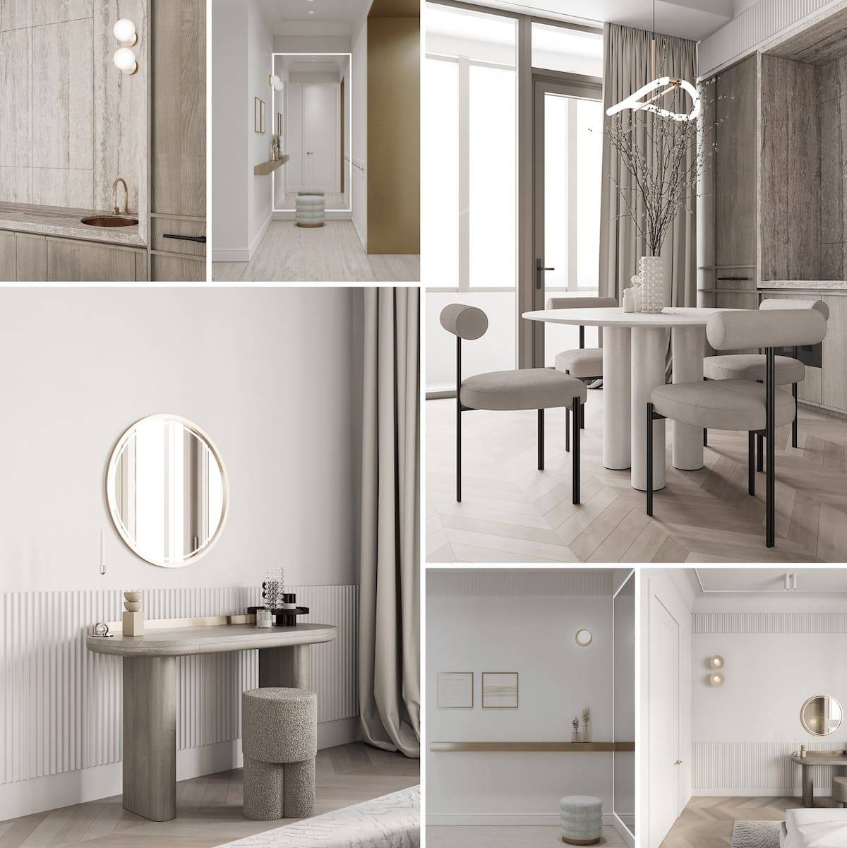 Из нейтральных цветов, которые при оформлении дизайна интерьера можно взять за основу, в моде тёмные оттенки бежевого. Этот цвет прекрасно сочетается с зелёным и белым, создавая приятную для глаз гамму. Зелёный цвет используется, как дополнение к нейтральным оттенкам белого и бежевого, а также серого. Последний оттенок по прежнему будет в моде, хотя и несколько «сдал свои позиции».